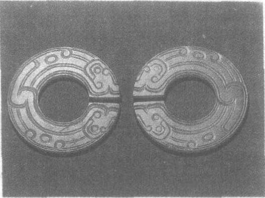 春秋早期。外径5.5厘米,内径2.3厘米,厚0.3厘米。1983年河南省光山县宝相寺黄君孟墓出土。河南省信阳地区文物管理委员会藏。两玉玦均为黄色,玉质纯净,形如有缺的环。一面光素无纹,一面以双钩线饰两组尾相接,头向缺口的夔龙纹。刻纹流畅,图案化较强。关于玦的用途历来说法不一,通常的说法有三种。一说是佩带之物。《说文》:“玉佩也”,其有力的证据出自于《史记·项羽本纪》:“范增数目项王,举所佩玉玦以示之者三”,可见玉玦为平时佩带之物。另一说起符节作用,《广韵》:“玦如环有缺,逐臣待命于境,赐环侧还,赐玦则绝。”罪臣被放逐期满时,朝廷赐玦(与绝同音)则示不允其返归。第三说玉玦为耳饰,这是近几十年的新提法。在新石器时代,西周晚期和春秋战国墓葬中,常发现玉玦被放在死者的耳旁,作耳饰玉器。众说纷纭的原因可能是此物本身原具多种用途。
