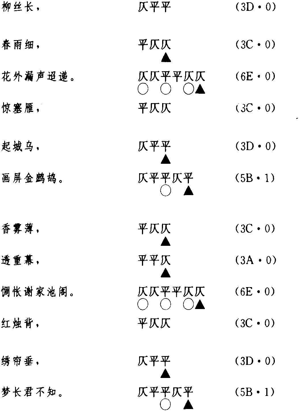 这是一首多变韵的词。首先用两个仄声韵: 细 读音x·i (ˋ)。苏计切,去,霁韵。为i韵目,属i—er韵部。 递 读音d·i (ˋ)。特计切,去,霁韵。为i韵目,属i—er韵部。 在今韵方面,押i韵目(第911韵目)。 在古韵方面,押霁韵(去声12)。其次,换用两个平声韵: 乌 读音·u (-)。哀都切,平,模韵。为u韵目,属u—ü韵部。 鸪 读音g·u (-)。古胡切,平,模韵。为u韵目,属u—ü韵部。 在今韵方面,押u韵目(第611韵目)。 在古韵方面,押模韵(上平11)。然后,再换用三个仄声韵。 薄 读音b·o (ˋ)。傍各切,入,铎韵。为o韵目,属e—o—uo韵部。 幕 读音m·o (ˋ)。末各切,入,铎韵。为o韵目,属e—o—uo韵部。 阁 读音g·e (ˊ)。古落切,入,铎韵。为e韵目,属e—o—uo韵部。 在今韵方面,押e—o—uo韵部(第820韵部)。 在古韵方面,押铎韵(入声19)。最后,又换用两个平声韵: 垂 读音ch·ui (ˊ)。是为切,平,支韵。为ui韵目,属i—ei—ui韵部。 知 读音zh·i (-)。陟离切,平,支韵。为i韵目,属i—ei—ui韵部。 在今韵方面,押i—ei—ui韵部(第920韵部)。 在古韵方面,押支韵(上平05)。 ☚ (17)陆游《诉衷情·当年万里觅封侯》 (19)李白《忆秦娥·箫声咽》 ☛ |