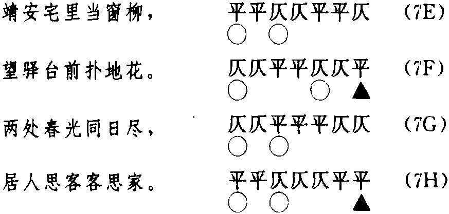 7E律句,是平起仄收句。在七绝中,以7E律句为首句的格式也有,但较少。现以白居易《望驿台》为例写出模式诗律如下: