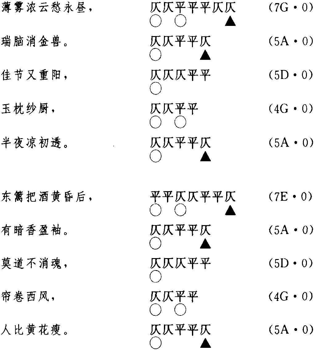 这首词,共押六个仄声韵,详况如下: 昼 读音zh·ou (ˋ)。陟救切,去,宥韵。为ou韵目,属ou—iu韵部。 兽 读音sh·ou (ˋ)。舒救切,去,宥韵。为ou韵目,属ou—iu韵部。 透 读音t·ou (ˋ)。他候切,去,候韵。为ou韵目,属ou—iu韵部。 后 读音h·ou (ˋ)。胡遘切,去,候韵。为ou韵目,属ou—iu韵部。 袖 读音x·iu (ˋ)。似救切,去,宥韵。为iu韵目,属ou—iu韵部。 瘦 读音sh·ou (ˋ)。所救切,去,宥韵。为ou韵目,属ou—iu韵部。 在今韵方面,以上六个韵字所押的韵是ou—iu韵部(第620韵部)。 在古韵方面,押宥韵(去声49)、候韵(去声50)。此二韵相邻且通押。 ☚ (21)黄庭坚《望江东·江水西头隔烟树》 (23)晏几道《鹧鸪天·彩袖殷勤捧玉钟》 ☛ |