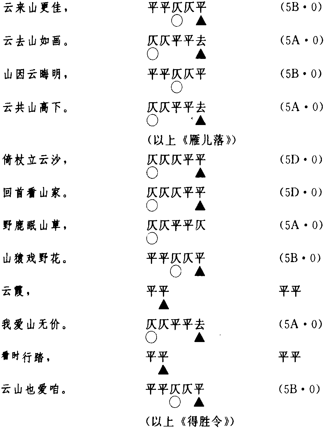 | 释义 | (29)张养浩《[双调]雁儿落带得胜令·云来山更佳》 (29)张养浩《[双调]雁儿落带得胜令·云来山更佳》《雁儿落带得胜令》为双调带过曲。《雁儿落》的句式为5—5—5—5,押1平韵2仄韵。《得胜令》的句式为5—5—5—5—2—5—2—5,押6平韵1仄韵。这首曲中,有2个衬字。