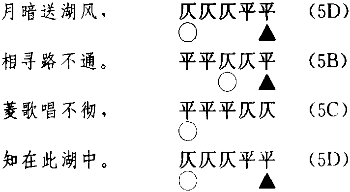 5D律句,是仄起平收句。在五绝中,以5D律句为首句的格式也有,但较少见。现以崔国辅《小长干曲》为例写出模式诗律如下: