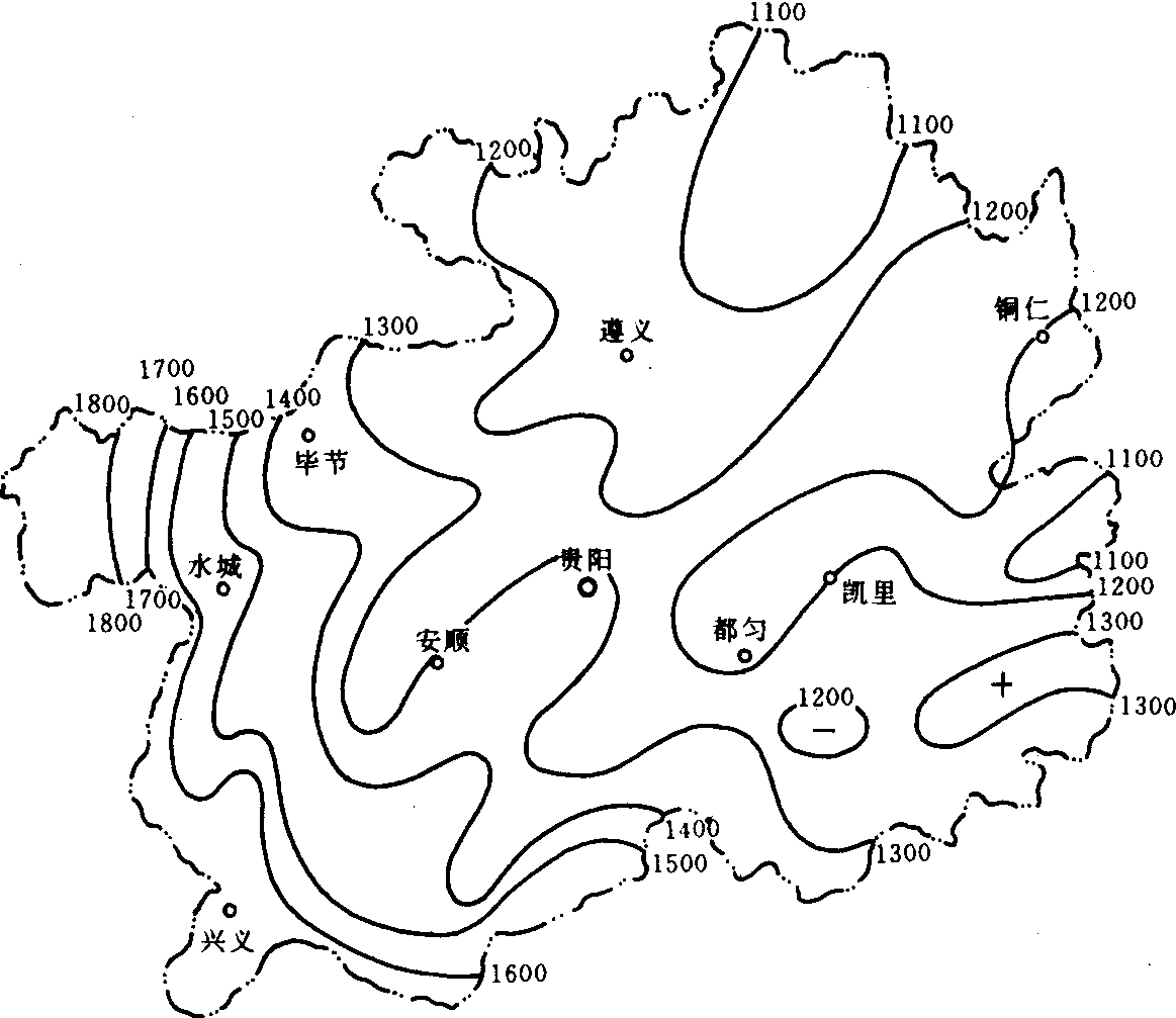 图1-1-2 贵州省年日照时数分布图(单位: 小时) 3. 日照时数。贵州大部分地区年日照时数在1 200—1 600小时之间(图1-1-2)。西部多,东部少。以威宁最多,平均达1 805.4小时;北部大娄山两侧和东部的清水江下游最少,平均不到1 100小时。≥10℃期间,大部分地区的日照时数在900—1 100小时之间,以南北盘江、红水河及赤水河下游最多,可达1 100—1 300小时,其中,罗甸多达1 362. 9小时,为全省之冠。威宁虽年日照时数最多,但是≥10℃期间日数最少,故≥10℃期间日照时数为全省最少,仅有783.3小时。 ☚ 一、农业气候资源 (二)热量资源 ☛ (一)光资源 (一)光资源