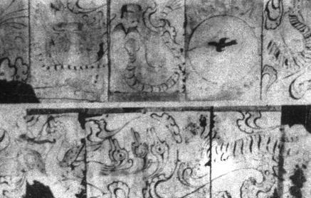 【作品赏析】: 1976年发掘的河南卜千秋墓,为西汉昭帝、宣帝(前86-前49)时期的墓葬,墓室壁画为西汉中期的作品。 壁画以长卷的方式展开,描写了墓主夫妇在仙人和神怪的伴随下升入天界的情景。壁画画在砖上,各砖有编号,是事先画好再按编号装配起来的。此图是全画的西半段。下层从左至右画朱雀(鹰头凤尾,展翅飞翔)、白虎(张口昂首,翘尾奔跑)。上层从左至右画仙女(已残、白兔;墓主人升天(女主人乘三足鸟,手捧三足乌;男主人乘舟行蛇,手持弓,均紧闭双目,后随奔狗,旁有蟾蜍);伏羲(男像,蛇身鱼尾,短发戴王冠,面目端庄威严);太阳(圆形涂朱色,内有一含食疾飞的金乌);黄蛇(蛇色混合怪物;蛇头、有双耳,前身有双鳍,象征太阳起落其中)。 此画年代稍晚于马王堆一号汉墓帛画和三号汉墓帛画,但作为壁画,则是迄今已发现的汉画中时代最早的。 从绘画技法来看,此壁画较之马王堆 一、三号墓帛画,又有很多新的因素。马王堆汉墓帛画,用笔有精细和粗犷之分,卜千秋墓壁画除仍具这种特点外,还在用笔上有了转折向背、轻重缓急,显得更为灵活,画面效果也富于有节奏感。例如:同样足曲线,在伏羲的蛇身、黄蛇、舟形蛇、白虎的背和尾、朱雀的颈和项等处,线条劲细有力,工整平稳,但在朱雀尾、云气等一处,用线则一笔之中有数处变化,既有粗细变化,又有运笔速度上的差别。白虎身上的花纹也是用精细的和粗率的两种线描组成,体现出西汉时绘画用线已达到相当水平。卜千秋墓壁画以其豪放潇洒的风格,在汉画中占有特殊的地位。 。  汉 河南洛阳卜千秋墓壁画 |