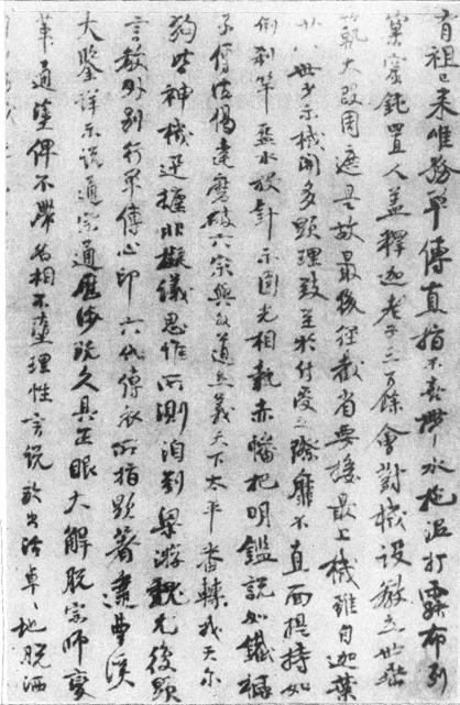 【赏析】: 这幅行楷书卷给人的最深印象是不落俗套,风格独特。在帖学盛行的宋代,于书法艺术上有显著成就的并不多,而“苏、黄、米、蔡”四大家都是学“二王”和颜眞卿的。圜悟的这幅《印可状》,我们可以淸晰地看出他不属于宋代那种“正宗”书法,他是直接取法于唐人写经,其用笔没有固定的法则,时方时圆,或转或折,有顿有提,不求一律,但通篇气势协调一致,并无芜杂之弊。笔画遒劲有力,即使是细如丝髮之笔,也决不飘浮,可见,他是悬腕提肘书写的。其书结体欹正多变,险中有稳。字距较密,而行距疏密不一,非常随意。所有这些都是与当时的帖学风格所格格不入的,也正因爲如此,他的书名不见经传。 |