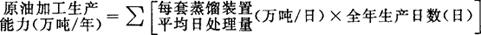 一般计算原油加工生产能力是指蒸馏装置(常减压蒸馏或蒸馏釜)处理原油的能力,不是各种专业加工设备(如裂化、脱腊、焦化等设备)能力的总和。各种二次加工设备的能力,应单独进行计算,分别表示。其计算公式如下: