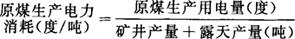 指用于原煤生产过程中包括矿井和露天回采,掘进剥离、运输、提升、通风、排水压风、坑木加工、瓦斯抽放、消火灌浆、井口选矸、矿井采暖、水砂填充、矿灯充电、矿机修理、工业照明、供水等用电量。