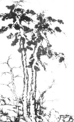 | 释义 | 双松图 【作品赏析】: 此图画两株巨松拔地而起并肩矗立,遒劲的枝于直入天际,簇簇松针深郁苍劲。 画家用浓墨圈点出老干的节疤,用浓淡不同的墨色钩出树干,树身愈近根部则用墨愈淡,最后与坡石溶为一体,显出苍松坚实的根基。苍松下的荆棘及地面上的小竹,既衬托了松的高大,又给画面增添了生机。全画笔法苍劲工稳,显示出作者深厚的艺术功力。 。