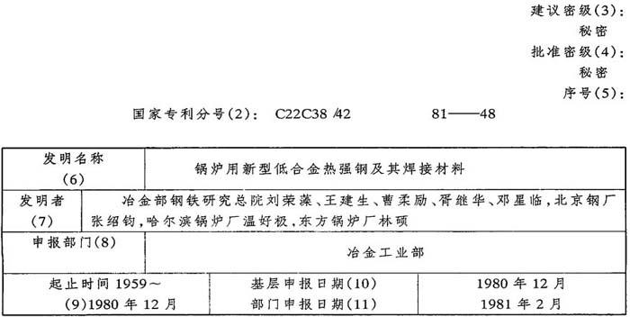 (数字由改编者略) 发明权项 1.锅炉用新型低合金热强钢(12Cr2M0WVTiB)以×%Cr为基,采用多元复合合金化,其化学成分(重量%)为:C×××,Si×××,Mn×××,Cr×××,W×××,V×××,Ti×××,B×××其余为铁及杂质。经热处理后,可以提高钢在600~620℃的持久强度,具有良好的综合机械性能及焊接性能。 2.根据第一项,多元复合合金化应使V、Ti与C按×××……配比,内控成分(重量%)为:C×××,Si×××,Mn×××,Cr×××,W×××,V×××,Ti×××,B×××其余为铁及杂质。 3.根据第一项,钢的正火温度为×××~×××℃,时间不少于××分钟,回火温度为×××~×××℃,时间×小时,空冷。 4.根据第一项,手工电弧焊采用与母材成分相近的“热347”焊条。对于≤Φ51毫米钢管的焊接,焊前可不进行预热,但当与联箱管边角焊接时,焊前需进行×××℃左右的预热。 5.根据第四项含钴镍焊丝的化学成分(重量,%)为×××,等离子焊接规范参数为×××……。 三、发明的作用意义(11-3) 1.性能对比: 102钢的合金元素总量只有3.5%左右,而其热强性则远超过了国外现有同类型钢及合金钢,达到了国外通常使用的高合金钢的水平。对比数据见表3。 2.经济效益: 在壁温600~620℃下,用102钢管取代12NiCr1M0V耐热钢管,一台20万千瓦机组锅炉的钢材费用可节省25万元。一年以6台计算,可节省150万元。目前已制成20万千瓦机组27台,共节省了672万元。102钢不仅在20千瓦机组上取代了昂贵的镍铬奥氏体钢,为国家节省了大量外汇,还在数十台5万、10万千瓦机组上取代12Cr1M0V钢作屏式过热器外圈,节省了材料费。 3.壁温600~620℃的锅炉受热面钢管,国外通常须使用镍铬奥氏体钢管。这种钢管冷弯后,必须对冷弯部分进行高温固溶处理,用102钢管时,冷弯后不必进行任何热处理,既简化了工艺又降低了制造成本。102钢除含少量铬外,其它合金元素均为我国所富有,有利于材料立足于国内。在5万、10万千瓦机组上取代12Cr1M0V钢作屏式过热器外圈,提高了发电机组运行的安全可靠性。过去使用12Cr1M0V钢管时,经常发生外圈爆管停炉,改用102钢后已避免了此类事故的发生。 四、发明可以应用的事实根据(11-4) 到1980年,北京钢厂生产的102钢已达5000吨。该厂工业试制的Φ32×4,Φ32×6mm102钢管,安装在北京热电厂,参数为555℃、140大气压顺流布置的七号炉作屏式过热器和高温三段过热器,于1966年3月开始运行至今已有11万小时,从未出现任何问题。 哈尔滨锅炉厂设计制造的20万千瓦汽轮发电机组锅炉设计参数为:蒸汽出口温度540℃/540℃,蒸汽出口压力140/36大气压。该炉的前后屏式过热器外圈、再热器高温段采用了102钢管,规格为Φ38×4.5、Φ42×5及Φ42×3.5mrn。这台炉子是我国设计制造的第一台20万千瓦机组超高压锅炉,朝阳发电厂于1973年4月1日并网发电,至1980年末已运行近8年,累计运行时间已近50000小时,证明102钢管在壁温610℃左右运行是稳定、正常的,有足够的安全可靠性。 目前哈尔滨锅炉厂、东方锅炉厂用102钢制造的20万千瓦机组已有27台。 我国第一台特大型60万千瓦机组(蒸汽参数为540℃、174大气压)即将投建,该配套锅炉的设计引进了美国CE公司技术。其中高温段过热器原设计须用含铌的铬镍高合金奥氏体钢(347)现已采用102钢取代大部分347钢。 本钢种于1980年12月由冶金部军工办组织鉴定(附件二)。应用证明见附件三。 五、保密重点(11-5) 1.钢的内控成分。 2.焊丝成分及等离子焊接规范参数。附件目录: 一、查阅国内外专利文献及非专利文献情况 二、鉴定证书 三、应用证明 四、发明人情况表 (所有附件均由改编者从略) 申报部门审查意见(14) 本发明结合我国资料条件,采用多元适量复合强化手段及适当的热处理工艺,研制成功102钢及焊接材料,工作温度可达620℃。目前世界各国大型电站锅炉(540℃,140大气压)过热器及再热器金属材料使用温度超过600℃时均使用铬镍奥氏体钢。102钢不仅在600~620℃热强性达到了奥氏体钢水平,而且综合机械性能、工艺性能及焊接性均优于奥氏体钢。到1980年102钢管的累计产量已达5000吨,制成27台20万千瓦机组,其中运行最长的已达11万小时(12年多)。经长期使用证明,该钢性能稳定,安全可靠,未发生任何爆管事故。用低合金钢代替铬镍奥氏体钢可节约铬镍资源、降低锅炉成本,具有明显的经济效果。特申请二等奖,定为秘密级。 冶金下业部 1981年6月8日 |