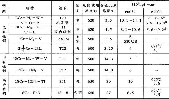 发明的详细内容及列为发明的理由(12) 一、当前国内外尚未解决(或国外保密)的技术问题(11-1) 本发明属于合金钢领域,主要用于制造锅炉过热器及再热器。锅炉过热器及再热器是蒸气动力设备的关键部件,不仅要求材料有良好的工艺性能和高温下有足够的表面稳定性,更重要的是要求材料在可能引起强烈蠕变的温度和压力条件下,可以工作十万小时以上。随著蒸汽参数的提高,当使用温度超过580℃时,在国外即使是性能较高的 和本发明最相近的钢种为苏联发展的12×2MΦCP,其化学成分(重量%)为:C0.08~0.15,Cr1.6~1.9,M00.5~0.7,V0.20~0.35,B≤0.005,余为铁及杂质。 使用奥氏体钢需要大量稀缺昂贵的镍铬,提高了机组造价,由于奥氏体钢的工艺和物理性能都较差,在运行过程中发生损坏的情况也较多。据美国统计,用321奥氏体钢制成的过热器损坏事例占26%,而用低合金钢只占9%〔附件一〕。 为了力求不用或少用奥氏体钢,近20年来世界各地对提高中、低合金钢的热强性方面进行了大量的研究工作,研制的钢种见表1(改编者略)。 从表中所列钢种及其持久强度看来,当温度为600~620℃时,热强性都没有达到镍铬奥氏体钢的水平。1976年法国专利2290503〔附件一〕中1Cr-1Mo-V-Nb-B钢在600℃下具有较高的持久强度( 由于上述原因,虽然人们早已察觉到提高蒸汽参数对节省能源的重大意义,但仍不得不在提高参数与选用材料之间作出权衡。目前各主要发达国家对新建机组所采用的参数大都为540℃/540℃。即使如此,仍需使用一部分镍铬奥氏体钢。 本发明针对锅炉用热强钢存在的上述问题,结合国内资源条件,采用多元适量复合强化手段及适当的热处理工艺,研制了一种低合金热强钢12Cr2M0WVTiB(简称102钢)。此钢不仅在600~620℃的热强性达到了常用的镍铬合金奥氏体钢的水平,而且综合机械性能、工艺性能及焊接性能均优于镍铬奥氏体钢。 二、发明的详细内容及发明权项(11-2) 1.为了满足600~620℃发电机组锅炉过热器及再热器的要求,本发明以×%Cr为基。采用多元低合金及微量硼复合强化。其化学成分(重量%)为:C×××;Si×××,Mn×××,Cr×××,MO×××,W×××,V×××,Ti×××,B×××,其余为铁及杂质。热处理后的机械性能及抗氧化性能见表2。 表2