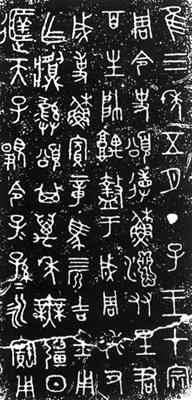 【简介】: 西周共和时器铭。史颂簋共四器同文,此其一也。搨本。大篆。六行,行十至十二字不等。共六十三字。郭沫若《两周金文辞大系图录考释》、文物出版社《商周靑铜器文选》(一)收入。 【赏析】:  西周晚期,金文大篆完全成熟,进入古文字发展线条化、规範化的高峰阶段。结构和章法上的严谨不言而喩,即使是笔法和线条,也出现模式化的唯美主义倾向,《史颂簋》铭文即是这一时期有代表性的作品之一。作品通篇秩序井然,而爲了打破整齐划一可能带来的单调,书写者有意破坏常规,把字形大小变化呈大幅度的摆动,从而使作品获得了参差错杂的生动和新鲜感。在用笔方面,书写者在追求气韵绵长的舒迟和隽永美感的同时,适当地把一些圆转变爲略呈方势和强直的线条形式,产生了和谐统一中的变化节律。秦人承继周人书法风格,于此可以窥见端倪。金文大篆发展到西周晚期,以端庄肃穆、雍容华丽的风格较爲常见,《史颂簋》则在其中添加了一点雄强的意气。是蕴涵著西周晚期的动蕩不安,抑或焦躁愤懑?是体现了四百年西周王室行将没落而欲中兴国势的勇武雄风?我们不得而知。但是,作品不同于往者和后来的时代精神,我们还是可以感受到的。 |