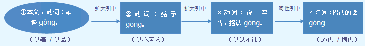 字源解说 共,甲骨文 像双手托举物品奉献。造字本义:献祭。“共”的“双手举物奉献”本义消失后,篆文 再加“人” (祭师)另造“供”代替。隶书 将篆文的 写成 。 附 文言版《説文解字》:供,設也。从人,共聲。一曰供給。 附 白话版《说文解字》:供,摆设。字形采用“人”作边旁,采用“共”作声旁。另一种说法认为,“共”是“供给”的意思。 引申线索