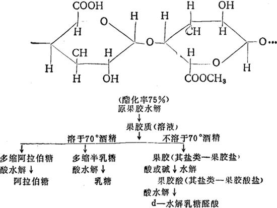 (2)半纤维素 介于淀粉与纤维素间的各种多缩戊糖和多缩己糖的混合物,为甜菜肉的23%。主要成分是多缩戊糖(树胶糖)。不溶于水,溶于碱。与1%的稀酸共热则水解为树胶糖、木糖、甘露糖、半乳糖和多缩糖醛酸(葡萄糖醛酸及半乳糖醛酸)的甲酯。受酶作用部分水解。受碱作用部分溶解,造成糖汁中胶体物和色素的增加。 2.果胶质 约占固形物的2.5%,为甜菜肉中最多的非糖分。果胶质是一种混合物。在甜菜肉中不溶于水的果胶称为原果胶质,可溶性的果胶质称果胶,即部分或全部酯化的多缩水解乳糖醛酸(约含7%的-O-CH3基)。 果胶(部分酯化的多缩水解乳糖醛酸)的结构式为: