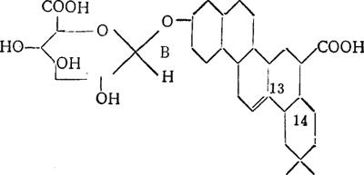 果胶质性质见第三章第一节。 3.有机酸 为甜菜中可溶性不含氮的非糖分的主要组成部分,约占不含氮非糖分的50%。主要为草酸、丙二酸、丁二酸、戊二酸、己二酸、三羧基酸、乌头酸、羟基乙酸、乳酸、苹果酸、酒石酸、柠檬酸、羟基柠檬酸及乙醛酸等。最多为草酸、柠檬酸和苹果酸。 (1)物理性质 溶于水,苹果酸和酒石酸具有旋光能力。 (2)化学性质 十分稳定。唯草酸、酒石酸和柠檬酸等与钙形成不溶性盐,有糖分存在时,随糖分浓度的增加其钙盐溶解度有所降低。乙醛酸在碱作用下发生自身氧化还原反应,生成草酸和羟基乙酸。 4.皂素 又名皂角苷,是葡萄糖苷类毒物。甜菜中约含0.14%,多存在于一毫米厚度的表皮和尾根。它具有极高的表面活性,能生成很稳定的泡沫。难溶于水而溶于酒精,其碱金属盐溶于水形成泡沫,钙盐不溶于水。在203~210℃溶化, 皂素与酸共热时,分解为皂角碱和葡萄糖醛酸,其结构式为: