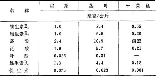 (3)尿圜碱 约占含氮物的1~2%。 (4)尿囊素 含量约为甜菜重的0.015%。 此外,甜菜中可遇到微量的黄尿圜、鸟粪素和腺尿圜。 11.色素 见第四章第一节。 12.铵盐和亚硝酸盐 在甜菜中的含量很少,与酰胺氮一起共0.02%,亚硝酸盐仅含0.004%。 13.芳香物 主要是吡咯类的醇,还有少量香草素、乙酰胺等,总量约0.005%。 14.维生素 甜菜中维生素含量可参阅表1-31。 表1-31 甜菜中维生素含量