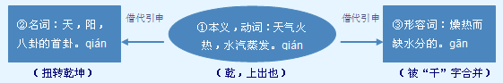 字源解说 乞,既是声旁也是形旁,是“气”的变形,表示蒸汽。乾,籀文 = (“朝” 的省略,表示日出)+ (火,炎热)+ (气,蒸汽),表示烈日里水汽蒸发。有的籀文 误将“气” 写成“乞” 。篆文 将籀文的 写成 。造字本义:烈日如火,水汽蒸发,空气燥热而缺少水分。隶书 将篆文的“朝” 写成 。在道家古老的阴阳观念中,天为阳,称作“乾”;地为阴,称作“坤”* 。 附 文言版《説文解字》: 乾,上出也。从乙,乙,物之達也;倝聲。 附 白话版《说文解字》: 乾,阳气向上升腾。字形采用“乙”作边旁;乙,表示无所不往;“倝”是声旁。 引申线索