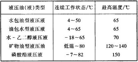 在寒区或严寒区野外工作时,当环境温度在-5~-25℃时,可用HV低温液压油;当环境温度在-5~-40℃时,可用HS低温液压油。 液压油(液)的使用温度对液压系统是相当重要的。液压设备中使用油(液)温度过高,会加速油、液氧化变质。长时间在高温下工作,油液的寿命会大大缩短。另外,氧化生成的酸性物质对金属起腐蚀作用,增加磨损,对液压系统不利。液压系统中油(液)适宜工作温度范围见表2.5-5。 表2.5-5 液压油(液)工作温度范围