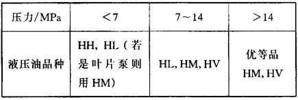 (2)工作压力 主要对液压油的润滑性即抗磨性提出要求。对于高压系统的液压元件特别是液压泵中处于边界润滑状态的摩擦副,由于正压力加大、速度高,而摩擦磨损条件趋于苛刻,因而必须选择润滑性即抗磨性、极压性优良的HM油。按压力选用油见表2.5-6。 表2.5-6 按液压系统和油泵工作压力选择液压油