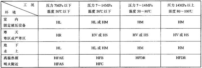 (3)工作环境 一方面要考虑液压设备作业的环境是室内、室外、地下、水上、内陆沙漠,还是处于冬夏温差大的寒区等工作环境。另一方面若液压系统靠近有300℃以上高温的表面热源或有明火场所,就要选用难燃液压油。按使用温度及压力选择液压油(液)可参见表2.5-7。 表2.5-7 依据环境和工况选择液压油(液)