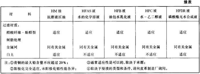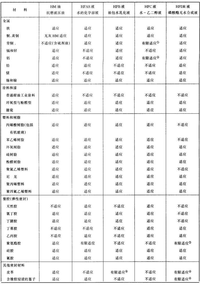 (4)液压泵类型 液压泵种类较多,如叶片泵、柱塞泵、齿轮泵等,同类泵又因功率、转速、压力、流量、金属材质等因素影响,使液压油(液)的选用比较复杂。一般说来低压泵可以采用HL油,对于中、高压泵应选用HM油。 液压油的润滑性(抗磨性)对三大泵类减磨效果顺序是叶片泵>柱塞泵>齿轮泵。叶片泵为主油泵的液压系统不管其压力大小选用HM油为好,因为叶片泵的叶片与定子间的接触和运动形式极易磨损,其钢对钢的摩擦副材料,最适于使用高锌HM抗磨液压油。 对于低压柱塞泵可用HM油和HL油,高压柱塞泵用含锌HM油,但柱塞泵中有青铜和镀银部件时,高锌抗磨剂会产生腐蚀磨损,这种柱塞泵要选用无灰或低锌抗磨液压油。 对于齿轮泵,采用HH,HL,HM油均可,但高性能齿轮泵应选用HM油。对于组合泵系统如由叶片泵和其它泵组合,应以叶片泵为主选用,当其它泵为柱塞泵时,所选的油还应被柱塞泵所接受的。 综合起来,通常HL油可优先用于轴向柱塞泵,但不适用于叶片泵,高锌HM油适用于各类叶片泵。无灰HM油适用于含有铜和银部件的轴向柱塞泵,也适用于中低压叶片泵,但不适用于高压叶片泵。低锌HM油则适用范围较宽,既适用于中、高压叶片泵,也适用于有铜和铜部件的柱塞泵。 (5)与材料的适应性 选用液压油(液)时,还要考虑油(液)与液压系统中的密封材料、金属材料、塑料、橡胶、过滤材料和涂料、油漆的适应性。适应性系指接触这些材料时无侵蚀作用。反之,这些材料也不会使油(液)污染变质,相互能适应。如不适应会产生金属腐蚀、橡胶和塑料的溶胀变形、涂料溶解等,造成系统运行故障,缩短系统使用寿命,同时也加快了油(液)的变质,缩短换油期。 各种液压油(液)与液压系统常用材料的适应性见表2.5-8。 表2.5-8 各种液压油与常用材料的适应性