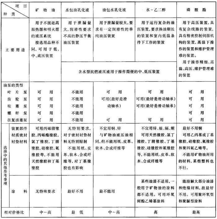 综上所述,各种类型液压油(液)及其有关品种的使用特点及有关注意事项可见表2.5-10。 表2.5-9 各类液压油(液)选择表