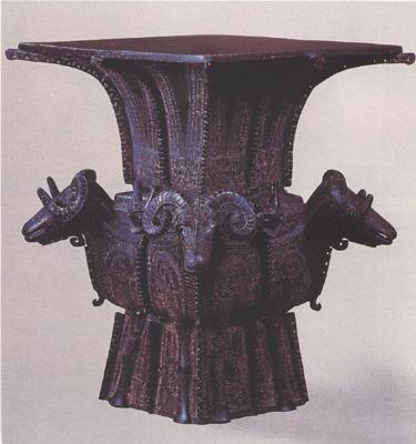 ◎盛酒器/商代后期 1938年湖南宁乡月山铺出土 高58.3厘米 口边各长52.4厘米 重34.5公斤/中国历史博物馆藏 ●此尊方口,大沿,颈部转折劲利,每面四隅及正中均饰蕉叶纹。 蕉叶纹中心各有觚棱,八条觚棱直伸出器口之外,造成器口外张之感。腹部四隅各铸高浮雕大卷角羊。羊的造型近于写实,但满身纹饰充满神秘。羊头突出于尊的中部,羊角向内曲,系用分铸法铸造。 形象真实而神情高贵,标志了商代工匠高超的造型能力。圈足上饰夔纹。全器上下均以雷纹为地,边角及中线有云纹扉棱。喇叭状方口边长几近身高,因腹部四羊突出,故无头重脚轻之感。 四羊尊集线雕、浮雕、圆雕为一体,器体庄严雄伟,是中国青铜艺术的重要代表作。 |