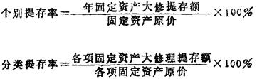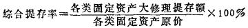 | 释义 | 固定资产大修理提存率 一定时期(年、月)固定资产大修理提存额与固定资产原价之比值,用百分数表示,通常以年为计量单位。固定资产大修理提存率,按计算对象分为个别提存率、分类提存率和综合提存率。个别提存率按每一项固定资产计算,分类提存率按每类固定资产计算,综合提存率按企业或部门所有的固定资产计算。各种提存率计算公式如下: