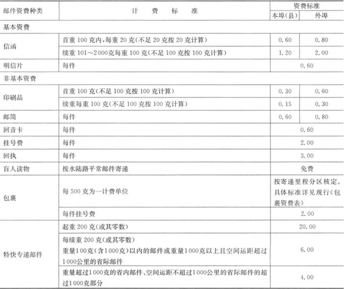 | 释义 | 国内邮件业务资费 用户交寄国内邮件应付给邮局的费用标准。 分两大类: ❷ 包裹资费。采用区域计费办法,把全国按照行政区划和经济联系划分为200多个计费区。 实行一区一费制:即在区内寄递不分距离采取统一的平均运费价,而每个区内的各局寄往其他计费区的包裹,均以两个区的中心局之间的距离为标准计算区间运费。2001年12月1日起实施的国内邮政电子汇兑资费标准见下表。 国内邮件资费简表 2001年12有1日起实施 单位:元