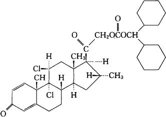C36H50Cl2O5=633.70 CAS-78467-68-2 9,11β-二氯-21-羟-16α-甲基孕甾-1,4-二烯-3,20-二酮二环己基甲基碳酸盐。 9,11β-Dichloro-21-hydroxy-16α-methylpregna-1,4-diene-3,20-dione dicyclohexylmethyl carbonate. 9,11-二氯-21-[[(二环己基甲氧)羰基]氧]-16-甲基孕甾-1,4-二烯-3,20-二酮。 9,11-Dichloro-21-[[(dicyclohexylmethoxy)carbonyl]oxy]-16-methylpregna-1,4-diene-3,20-dione. 肾上腺皮质激素类药,消炎药,抗过敏药。氯西可通。 Locicortlone,Locicortone Dicibate. INN,USAN.  |