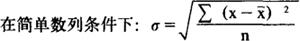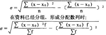 又叫标准差(σ)。 它是总体单位各标志值(x)与其平均数( )的离差平方的算术平均数的平方根。其计算公式如下:  式中:n表示总体单位数。 在次数分配数列条件下:  式中:f表示各组的单位数(次数)。 当标志数值很大时,为简化起见,可直接假定任意数x0为算术平均数,应用以下简捷法计算标准差: 在资料未经分组时:  在等距数列的情况下:  式中:d表示组距。 在异距数列时,可采用资料已分组的方法。 由于标准差采用了平方的方法来消除离差的正负号,比较符合数学要求。所以在统计研究中广泛用它来说明次数分配的离散趋势。但由于它是一个有计量单位(与平均数相同)的绝对指标,它的大小不仅取决于标志值的离散程度,还取决于数列水平的高低。 因而对于不同平均水平的数列或总体,就不宜直接通过标准差,来比较其标志变动度的大小。 |