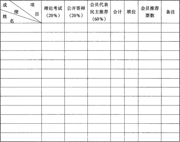 | 释义 | 基层工会主席的选举工作制度 (一)准备工作阶段 1.调查摸底,确定条件。竞选领导小组办公室与基层单位党委共同对选举单位所属干部进行调查摸底,向竞选领导小组报告。竞选领导小组根据调查摸底的情况,确定选举单位参加竞选工会主席的报名条件。 2.印发通知,宣传发动。竞选领导小组拟定“关于××单位公开竞选工会主席的通知”,以本单位党委、本单位工会的名义下发选举单位。由选举单位党委、工会根据通知精神,向全体会员进行广泛的宣传。 3.根据本单位公开竞选基层工会主席领导小组提名,组成公开竞选工会主席考评委员会,负责公开竞选工作。考评委员会设主任委员一人,委员若干人。 4.选举单位会员代表大会推选三名至五名会员代表,组成监督小组,代表会员群众,对公开竞选的全过程进行监督。 (二)报名工作阶段 1.竞选领导小组办公室与选举单位党委一道,分别与符合报名的干部谈话,征求本人意见,确定报名人选。 2.选举单位党委集体研究,在符合报名条件的干部中推荐三名至五名基层工会主席候选人,推荐结果在会员代表大会上公布。 3.选举单位工会委员会集体研究,在符合报名条件的干部中推荐三名至五名基层工会主席候选人,推荐结果在会员代表大会上公布。 4.选举单位工会委员会组成专门工作小组,组织车间工会和工会小组,动员会员群众自下而上推荐工会主席候选人,以无记名的方式填写“工会委员会主席候选人民主推荐表”,每个会员推荐一名二名候选人。会员群众推荐之前,专门工作小组应将竞选者的简历打印,发给会员群众,供民主推荐时参考。 (三)对候选人的资格审查阶段 1.竞选领导小组根据报名条件,对报名的竞选人员进行资格审查。资格审查的内容包括竞选者的学历、年龄、党龄、职务、工作表现和工作经历及廉洁自律情况。 2.公布参加公开竞选人员名单。 (四)进行理论考试和成绩评定 1.公布复习范围。根据为用而考、考用一致的原则和基层工会主席的任职需要,复习范围为:政治理论知识,劳动法律、法规知识,工会专业常识,本单位生产管理知识和所在行业的基本知识。以工会专业常识为主。竞选领导小组办公室应发放必要的复习参考资料。 2.理论考试。考评委员会印制试卷并组织考试,指定评委负责阅卷。 3.成绩核定。由会员代表监督小组核定考试成绩,填写“公开竞选工会主席理论考试成绩登记表”,阅卷人员和监督小组成员签名备案。 (五)审阅自荐报告 1.考评委员会全体委员审阅竞选的自荐报告,根据自荐报告质量进行评分。 2.考评委员会向全体竞选人员公布理论考试和自荐报告成绩,目的在于让竞选者自己选择是否继续参加竞选。对中途自愿退出竞选者,尊重本人意愿,不公布理论考试成绩,其余人员参加公开答辩。 (六)公开答辩阶段 考评委员会召集选举单位全体会员代表和部分职工群众,参加公开答辩会,答辩程序如下: 1.考评委员会拟定公开答辩试题和评分要点。 2.抽签决定答辩程序。 3.公布参加公开答辩人员名单和答辩顺序。 4.公布评委名单。 5.单位领导讲话。 6.竞选者按抽签决定的顺序依次作自荐报告,回答评委提出的问题,评委当场填写“公开答辩测评登记表”,但不亮分。 7.考评委员会统计每个评委的测评得分,其平均值即为竞选者公开答辩个人得分。个人得分经监督小组核实签名后计入“公开答辩测评汇总表”。 (七)代表推荐工作 1.考评委员会公布选举单位党委、工会委员会推荐名单,理论考试、公开答辩成绩和会员群众推荐票数。 2.考评委员会组织会员代表无记名填写“工会主席候选人民主推荐表”。 3.考评委员会统计代表推荐个人得票数,换算出竞选人员代表推荐得分,经监督小组核实签名,记录在案。换算公式为: 表六 公开竞选工会主席理论考试成绩登记表 表九 公开竞选工会主席答辩测评登记表