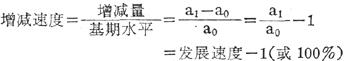 上式:a0代表最初水平,a1代表报告期水平。 增减速度有定基增减速度和环比增减速度。从定基发展速度或累计增减量计算的增减速度,为定基增减速度;从环比发展速度或逐期增减量计算的增减速度,为环比增减速度。两种增减速度不能直接换算。如果要换算,先将环比增减速度加1(或加100%)化为环比发展速度后,再连乘计算出定基发展速度,而后再减去1(或100%),求得定基增减速度。 |