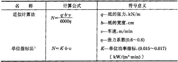| 释义 | 复卷机的传动 1.复卷机传动的要求 ❶ 复卷机车速较高,可达1500~2500m/min或更高.通常的调速范围是1∶3~1∶5。 ❷ 为简化传动,引纸车速达40~90m/min。 ❸ 复卷机平均加速度通常为0.23~0.37m/s2,加速时间为50~60s,制动的平均减速度为0.42~0.75m/s2,制动时间约40s。 ❹ 在工作车速范围内,速度波动值不超过±0.3%。 ❺ 能自动保持张力稳定,近代复卷机配置两台直流电动机,分别传动2个支承辊,使纸卷内外紧度合适。 ❻ 高速复卷机的引纸辊、刀辊,要设置传动装置和制动装置,厚纸卷要有启动助动装置。 2.复卷机传动功率 表11-8-24 复卷机的功率计算
