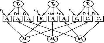 | 释义 | 多质多法模型 结构方程模型的一种。 一组变量若从理论上可有两种不同的方式分组,则可建立多质多法模型。如9个心理测验测量了3种人格特质(TA,TB,TC),采用3种不同的测量方法(M1,M2,M3)。 若假设特质之间和方法之间相关,则可以建立一个与下面路径图相应的多质多法模型。