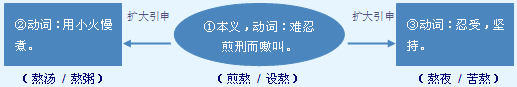 字源解说 敖,既是声旁也是形旁,是“嗷”的省略。熬,金文 = (敖,“嗷”的省略,痛苦而号叫)+ (火,煎迫),造字本义:难以忍受火刑煎迫而嗷嗷叫。篆文 承续金文字形。赤足履火为“煎”;难忍火刑为“熬”。 附 文言版《説文解字》:熬,乾煎也。从火敖聲。 附 白话版《说文解字》:熬,干煎。字形采用“火”作边旁,“敖”是声旁。 引申线索