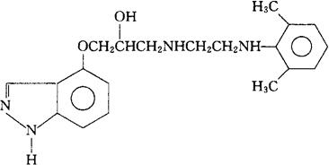 C20H26N4O2=354.45 CAS-86140-10-5 (±)-1-(1H-吲唑-4-基氧)-3-[[2-(2,6-二甲苯胺基)乙基]氨基]2-丙醇。 (±)-1-(1H-Indazol-4-yloxy)-3-[[2-(2,6-xylidino)ethyl]amino]-2-propanol. 1-[[2-[(2,6-二甲苯基)氨基]乙基]氨基]-3-(1H-吲唑-4-基氧)-2-丙醇。 1-[[2-[(2,6-Dimethylphenyl)amino]ethyl]amino]-3-(1H-indazol-4-yloxy)-2-propanol. β-受体阻滞药。 Neraminol,Intaetrol,BM 14298. INN,USAN.