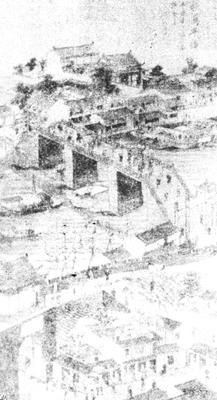 | 释义 | 姑苏万年桥 【作品赏析】: 我国的木版年画,自明末以来各地都有刊印,但其中影响较大、艺术成就较高的,在北方是杨柳青的年画,在南方则是苏州桃花坞的年画。 桃花坞年画的鼎盛时期是在清代乾隆年间,这个时期的年画景物复杂,画法工致,雕刻精细,而且很多是以建筑物为主体,以场面浩大的都市风光为主题。这幅《苏州万年桥》,上面有“辛西春日仿大西洋笔法”的题识,是乾隆六年(1741)桃花坞年画盛期的代表作品。 在清代“康乾盛世”,苏州是最重要的工商业城市之。万年桥在该城阊门外,是当年商业的中心地带,商贾云集,坊市棋列,十分热闹。 为了适应当时商业城市发展的需要,乾隆五年改建了古老陈旧的万年桥。自此以后,不少年画均以这座改建后的万年桥及其周围的闹市风光为题材,画家们不厌其烦地仔细描画出书楼、茶室、酒坊、客栈、钱庄、浴室、麻油店、酱油店、腌鱼行等等,充分表现了乾隆盛世时苏州的繁华景象。 这里介绍的是这类年画中的一幅,也是桃花坞年画中有年款的最早的一幅。画面的左下角画了苏州阊门的一角,城墙向右延伸,把画面的三分之一空间围住,这是城里。画面的中部是横跨河上的新建筑——万年桥。 画面的上部是城外,同样是高门甲第,店铺林立,比城内毫不逊色。 这幅年画在艺术上的最大特点是中西结合。画家以中国传统山水画的高远法为基础,用立方体的建筑物代替山头,构成以建筑物为主体的都市风光画。 建筑物的画法,则以传统的界画手法,参以西洋画的透视法,并渲染明暗,画出阴影,一如邹一桂在《小山画谱》上说的:“西洋画善勾股法,故其绘画,于阴阳远近不差锱黍,所画人物、屋树皆有日影。”另外在雕版技术上,也仿照西洋铜版(腐蚀版)的刻法。在风格上,明显可见郎世宁等来华的西洋画家画风的影响。这种中西结合的绘画技法,是这个时期桃花坞年画的一大特点,虽然不免尚有生硬之感,但其创新的精神却是可贵的。画上的“仿大西洋笔法”的题识,一如当时文人画家标榜“仿黄子久”、“仿董巨笔法”一样,鲜明地反映著一个时代、一个阶层的审美意识和一股新的美术思潮。。