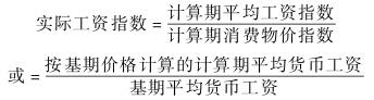 用百分比表示的两个不同时期实际工资的对比。它反映雇佣劳动者在不同时期用货币工资所能买到的商品和劳务在数量上的增减变化程度。其计算公式如下: