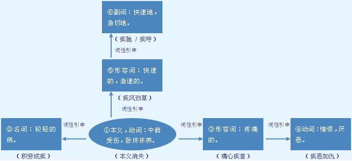 jí ❶形快;迅速。手疾眼快|疾驰 →❷形迅猛。疾风知劲草 →❸名病。讳疾忌医 ❹动 疼。痛心疾首 ❺ 形 (生活上的)痛苦。疾苦 ○❻动厌恶;憎恨。疾恶如仇用法说明统读 jí,不读 jī。