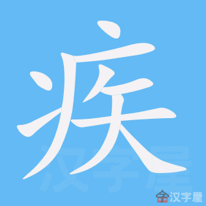 字源解说 疾,甲骨文 = (大,人)+ (矢),像一个人被箭矢射中。造字本义:中箭受伤,卧床休养。侯马盟书 省去“人” 加“疒”(病床) ,篆文 承续侯马盟书字形。隶书 将篆文的“疒” 写成 。外伤为“疾”,内患为“病”。 附 文言版《説文解字》:疾,病也。从疒,矢聲。 ,古文疾。 ,籀文疾。 附 白话版《说文解字》:疾,小病。字形采用“疒”作边旁,采用“矢”作声旁。 ,这是古文写法的“疾”。 ,这是籀文写法的“疾”。 引申线索