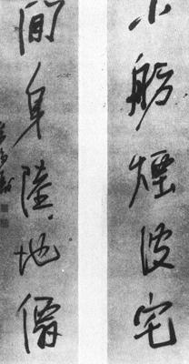 【简介】: 淸·陈鸿寿书。纸本。行书。149.4×25cm。五言联一则。凡上下联正文十字,款三字。刊于日本《书道全集》(二十四)。 【赏析】: 陈鸿寿的行书对联:“小舫烟波宅,閑身陆地仙”总体效果和谐,错落有致。字的造型舒展大方,欹侧多变。用硬毫笔书写,线条圆劲有力,下笔自然,不加雕饰。行笔均匀中有疾澁提按。中途变换笔势的现象较多,节奏轻松流畅,用墨燥润相间,润中有燥。“烟波宅”、“地”等字,偶出笔花,增加了用笔的自然和力度感。字的结体瘦长,下部收紧,左低右高,放纵姿肆,给人以强烈的流动感。“宅”、“仙”二字,居上下联之末,用笔挺拔,墨色厚重,加强了上下联的稳定感。 陈氏生活在乾嘉年间,酷嗜摩崖碑版,工绘画篆刻,不斤斤于笔墨技巧,不随和当时妍弱之风。从此联也不难看出陈氏书法有较爲深厚广博的渊源。  不足之处是个别字的造型尙欠优美,线条的运动变化尙不够丰富。但这只是“白璧之瑕”,无损于陈氏书法的艺术风格。或恐正是“乃见天趣”之所在。 |