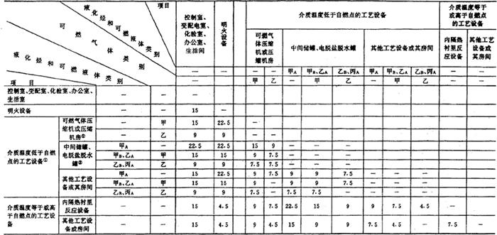 注: ❷ 单机驱动功率小于150kW的可燃气体压缩机,可按介质温度低于自燃点的“其他工艺设备”确定其防火间距。 ❸ 中间储罐的最大容积,应符合本规范第4.2.28条的规定。当单个液化烃储罐的容积小于50m3、可燃液体储罐小于100m3、可燃气体储罐小于200m3时,可按介质温度低于自燃点的“其他工艺设备”确定其防火间距。中间储罐与电脱盐脱水罐之间的防火距离,不应小于9m。中间储罐之间的防火距离,应符合本规范第五章的有关规定, ❹ 含可燃液体的水池、隔油池等,可按介质温度低于自燃点的“其他工艺设备“确定其防火间距。 ❺ 对丙a类液体设备的防火间距不限。 ❻ 设备的火灾危险类别,应按其处理、储存或输送物质的火灾危险性类别确定;房间的火灾危险性类别,应按房间内火灾危险性类别最高的设备确定。 (2)有突然超压或发生瞬时分解爆炸危险物料的反应设备,如设安全阀不能满足要求时,应装爆破片或爆破板和导爆管。 (3)因物料爆聚、分解造成超温、超压,可能引起火灾、爆炸的反应设备,应设报警信号和泄压排放设施,以及自动或手动遥控的紧急切断进料设施。 (4)可燃气体压缩机、离心式可燃液体泵在停电、停汽或操作不正常情况下,介质倒流可能造成事故时,应在其出口管道上安装止回阀。 (5)加热炉燃料气调节阀前的管道压力等于或小于0.4MPa(表压)且无低压自动保护仪表时,应在每个燃料气调节阀与加热炉之间设置阻火器。 (6)甲、乙A类设备和管道,应有惰性气体置换设施。 (三)工艺管道安全设计 工艺管道是石油化工生产过程中不可缺少的环节,它像人的血管一样,把各种设备装置连接沟通起来,形成流动线,将水、蒸气、气体及各种流体物料输送到所需要的地方。因此,对工艺管道进行安全设计十分重要。从消防安全角度考虑,工艺管道的连接和敷设应符合以下要求: 1.可燃气体、液化烃、可燃液体的金属管道除需要采用法兰连接外,均应采用焊接连接。公称直径等于或小于25mm的上述管道和阀门采用锥管螺纹连接时,除含氢氟酸等产生缝隙的腐蚀性介质管道外,应在螺纹处采用密封焊。 2.可燃气体、液化烃、可燃液体的管道应架空或沿地面敷设。必须采用管沟敷设时,应采取防止气液在管沟内积聚的措施,并在进、出口装置及厂房处密封隔离,管沟内的污水应经水封井排入生产污水管道。 3.可燃气体、液化烃、可燃液体的管道不得穿过与其无关的建筑物、构筑物的上方或地下。如必需跨越厂内铁路和道路,其净空高度分别不应小于5.5m和5m;如横穿铁路或道路时,应敷设在管涵或套管内。 4.跨越铁路、道路及泵房(棚)的工艺管道上,不应设置阀门、法兰、螺纹接头和补偿器等,以免漏料著火,阻断交通和影响机泵正常运转。 5.工艺和公用工程管道共架多层敷设时,宜将介质温度等于或高于250℃的管道布置在上层;液化烃及腐蚀性介质管道布置在下层;必须布置在下层的介质温度等于或高于250℃的管道,可布置在外侧,但不应与液化烃管道相邻。 6.氧气管道与可燃气体、液化烃、可燃液体的管道共架敷设时,氧气管道应布置在一侧,与上述管道之间宜用公用工程管道隔开,或保持不小于250mm的净距。 7.公用工程管道与可燃气体、液化烃、可燃液体的管道或设备连接时,在连续使用的公用工程管道上应设止回阀,并在其根部设切断阀;在间歇使用的公用工程管道上应设两道切断阀,并在两阀间设检查阀。 8.进、出装置的可燃气体、液化烃、可燃液体的管道,在装置的边界处应设隔断阀和8字盲板,在隔断阀处应设长度等于或大于8m的平台,并在两个方向设梯。 (四)其他安全设计的要求 1.工艺设备本体(不含衬里)及其基础管道(不含衬里)及其支、吊架和基础,应采用非燃烧材料,但油罐底板垫层可采用沥青砂。 2.工艺设备和管道的保温层应采用非燃烧材料,当设备和管道的保冷层采用泡沫塑料制品时,应为阻燃材料,其氧指数不应小于30。 3.单个容积等于或大于5m3的甲、乙A类液体设备的承重钢框架、支架、裙座;介质温度等于或高于自燃点的单个容积等于或大于5m3的可燃液体设备承重钢框架、支架、裙座;以及加热炉的钢支架,应覆盖耐火极限不低于1.5h的保护层。 4.散发爆炸危险粉尘和可燃纤维的场所,应采取防止粉尘和纤维扩散飞扬的措施。 5.有可燃液体设备的多层建筑物,应采取防止可燃液体渗漏至下层的措施。 6.生产或储存不稳定的烯烃、二烯烃等物质时,应采取防止生成过氧化物、自聚物的措施。如控制含氧量和加相应的抗氧剂、阻聚剂等。 7.可燃气体压缩机的吸入口管道,应有防止产生负压的措施。当由高压段的气液分离器减压排至低压段的分离器内或排油水到低压油水槽时,应有防止串压、超压爆破的安全措施。 8.在爆炸危险区范围内的转动设备若必须使用皮带传动,应采用防静电皮带。空气冷却器安装在空中,又有强制通风,可采用三角皮带传动。 9.在使用或产生甲类气体或中、乙A类液体的装置内,宜按区域控制和重点控制相结合的原则,设置可燃气体报警器探头。 10.凡有隔热衬里的设备(加热炉除外),其外壁应涂刷超温显示剂或设置测温点。 11.可燃气体的电除尘、电除雾等电滤器系统,应有防止产生负压和含氧量超过规定指标能自动切断电源并能放空的设施。 12.正压通风设施的取风口,宜位于甲、乙A类设备的全年最小频率风向的