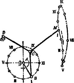 缝纫机的铰链四杆挑线机构,以曲柄AB作主动件,带动连杆BC,使BC的M点按图中点划线轨迹运动,完成缝纫要求的挑线动作。运动中应满足的条件:M点由上部Ⅸ经Ⅰ、Ⅲ到下部V的一段中(对应曲柄转过240°),每一位置的放线量近似等于所需供线量与一定余量值的和;在由V经Ⅶ到Ⅸ的一段中(对应曲柄转过120°),实现急回运动。 例5.2-71 振摆式轧钢机构