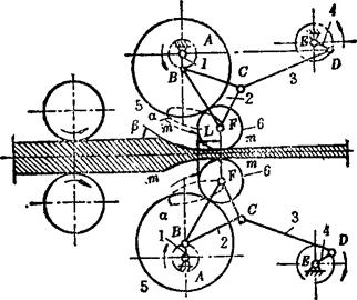 该机构由上下对称的五杆机构组成。1、4为主动曲柄,5为支承辊,6为工作辊。当1、4转动时,工作辊的中心F按轨迹a曲线运动,并对钢材进行轧制。工作辊在不同位置时的包络线,即为钢坯开口处的形状mm。轧辊与钢坯开始接触点处的咬入角β宜小,以减轻送料辊的载荷;直线段L宜长,使钢材表面平整。该机构各构件的长度不变,仅改变两主动曲柄的转速,即可使杆2的点F的轨迹a及工作辊的包络线mm发生变化,使轧制钢坯的开口度相应增加或减小。因此,在无专门的压下装置时,可以轧制规格范围变化不大的各种轧件。 例5.2-72 掘薯机固定凸轮机构