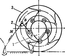 凸轮1固定在机架上,在地面滚动的圆轮3装有有摆动杠杆2。摆杆2的一端以滚子A靠紧凸轮轮廓,另一端装有挖掘器M。当轮3绕凸轮轴向前转动时,以铰链B带动摆杆2同向转动,滚子A随凸轮向径的增大,使杆2另一端的M点逐渐外伸,并按图示点划线轨迹运动,完成挖掘动作。 例5.2-73 插秧机分插机构