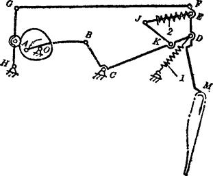 铰链五杆机构CDFGH中,摆杆CD的运动由曲柄连杆机构OABC控制,摆杆HG的配合运动由凸轮控制,连杆FD(秧爪)上的一点M按图示点划线轨迹运动。为减少铰链间隙对秧爪运动精度的影响,把凸轮机构的力封闭弹簧2放在JE上。因为作用于连杆FD的弹簧力使构件间的接触相对稳定,从而可提高分秧精度。弹簧1用于平衡秧爪的惯性冲击力,使机构工作平稳。 例5.2-74 接纸凸轮连杆机构
