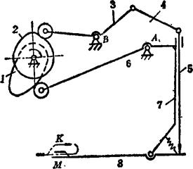 双联凸轮中的控制构件6和与其固联的套管7-起绕A转动,凸轮2通过构件3、4控制5在7中作相对移动,使构件8的左端M沿轨迹K运动,完成接纸动作。 例5.2-75 实现任意轨迹的凸轮连杆组合机构