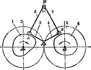 凸轮1、6分别和齿轮2、5固连。当主动齿轮2转动时,凸轮1推动滚子A和连杆8,轮2通过从动轮5、凸轮6推动滚子B和连杆7使M点按预先设计轨迹运动。图中的M点轨迹为“8”字形。 |