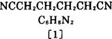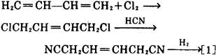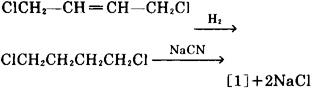 ❹ 己二酸与过量氨在磷酸催化剂存在下,进行反应,生成己二酸铵,再加热脱水,生成酰胺,进一步脱水,生成粗制[1],再精馏精制,可制得[1]。 ❺ 以丁二烯为原料,在65~75℃下和氯进行气相加成,生成1,4-二氯-2-丁烯,再在催化剂氯化亚铜、氯化氢及氯化钾存在下,用氰化氢处理,生成1,4-二氰-2-丁烯,再在钯催化剂存在下,于250℃下加氢,可制得[1]。