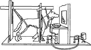 | 释义 | 巴甫洛夫条件作用实验 巴甫洛夫以狗为实验对象来建立铃声引起唾液分泌的经典条件作用实验。 一般实验装置(如图):用一副套具把狗固定于隔音室食物台前的位置上,用一导管从狗的唾液腺口收集唾液,并将该导管与记录唾液分泌总量和分泌滴数的装置相连。实验开始时,先呈现铃声,狗并未分泌唾液,此时铃声仅是中性刺激。之后,让铃声先于食物数秒钟出现。这样将铃声与食物多次配对后,当只给铃声而无食物时,也引起狗分泌唾液。中性刺激铃声因与食物的多次配对而成为食物的信号,即条件刺激,从而引起狗分泌唾液这一条件反应。巴甫洛夫将铃声与唾液分泌之间联系的建立称为条件反射。 在这类实验基础上,他提出条件反射学说,并以条件反射为指标,探讨了高级神经活动规律,提出两种信号系统学说、高级神经活动类型学说等。